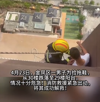 险!男子为捡拖鞋跌落至窗外,蓝朋友紧急救援!