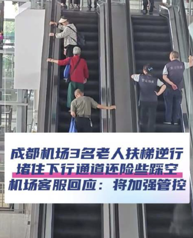 成都机场3名老人扶梯逆行堵住通道。8月13日,四川成都,网友发布视频表示:成都机场3名老人扶梯逆行,堵住下行旅客,一名红衣老人还险些踩空。对此,8月14日,@第一现场 采访机场客服回应称:该行为存在安全隐患,已记录相关情况并将转给相关部门核实处理,将加强管控以避免类似不文明不安全情况发生。