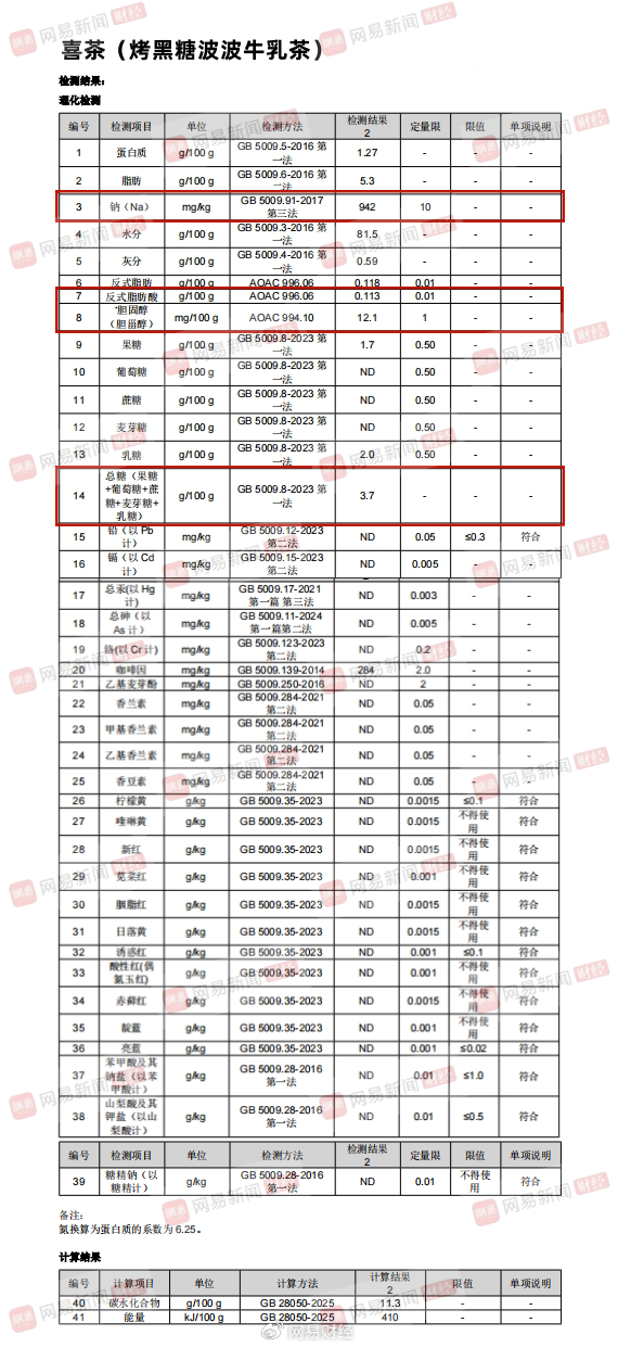 此外,此次检测中,奶茶中的”隐形盐"问题尤为突出。检测显示,上述8款现制奶茶钠含量介于100-900mg/kg之间,其中,喜茶烤黑糖波波牛乳茶以942mg/kg高居榜首。按500ml容量换算,单杯含钠约471mg(相当于1.2克食盐),比含量最低的茶百道(109mg/kg)高出8.6倍,超出其余7款平均值5.2倍。