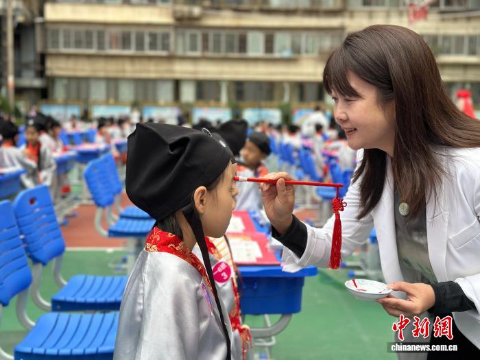 图为师长为新生点朱砂启智。杨娜 摄