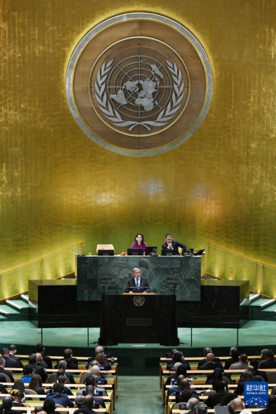 9月23日,在位于纽约的联合国总部,联合国秘书长古特雷斯在第80届联合国大会一般性辩论开幕式上致辞。新华社记者李睿摄