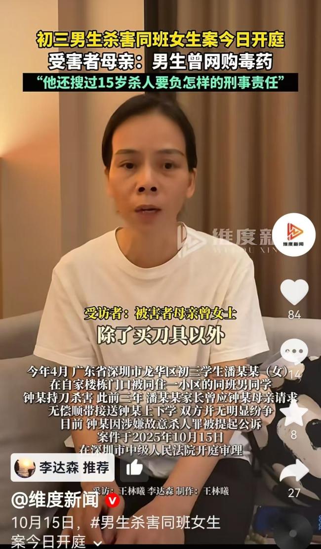 深圳初中生杀害同学案后续 凶手预谋作案引发关注!10月15日,深圳一名初三男生因涉嫌杀害同学潘某某的案件开庭审理。庭审前,潘某某的母亲接受了采访,讲述了女儿被杀的大致经过。命案发生在4月份,这名男孩预谋作案,不仅在网上购买了行凶用的刀具,还尝试购买毒药,但由于毒药是管制用品未能成功发货。男孩在杀人前曾搜索过他这个年龄段(15岁)的人如果杀人会面临怎样的刑事责任。