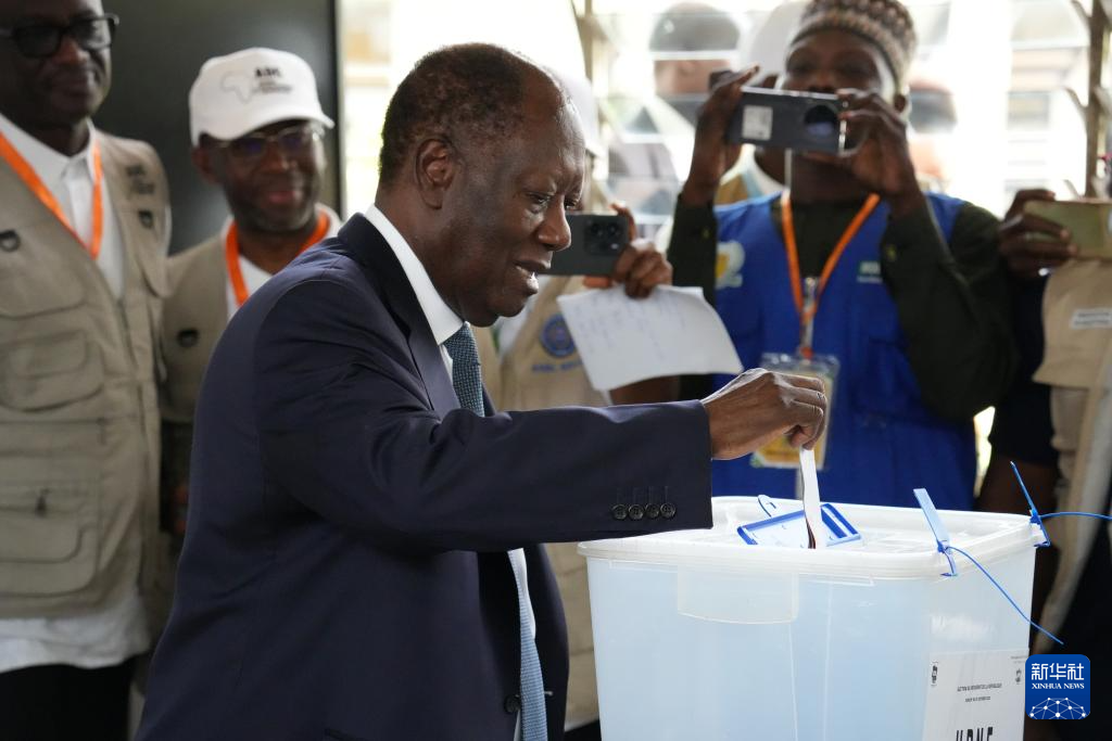 10月25日,在科特迪瓦经济首都阿比让的一处投票站,科特迪瓦现任总统阿拉萨内·瓦塔拉将选票放入投票箱。新华社记者 张健 摄