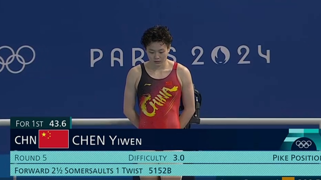 陈艺文在第十四届全运会女子单人三米板决赛中,最后一跳以76.50分的成绩稳居第一。‌