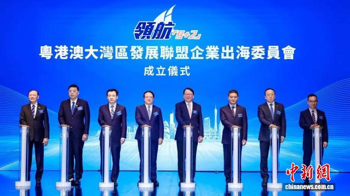 11月26日,领航“9+2”第六届粤港澳大湾区发展论坛暨颁奖典礼在香港举行。图为香港特区政府政务司司长陈国基(右四)等嘉宾见证领航“9+2”粤港澳大湾区发展联盟企业出海委员会成立仪式。(主办方 供图)