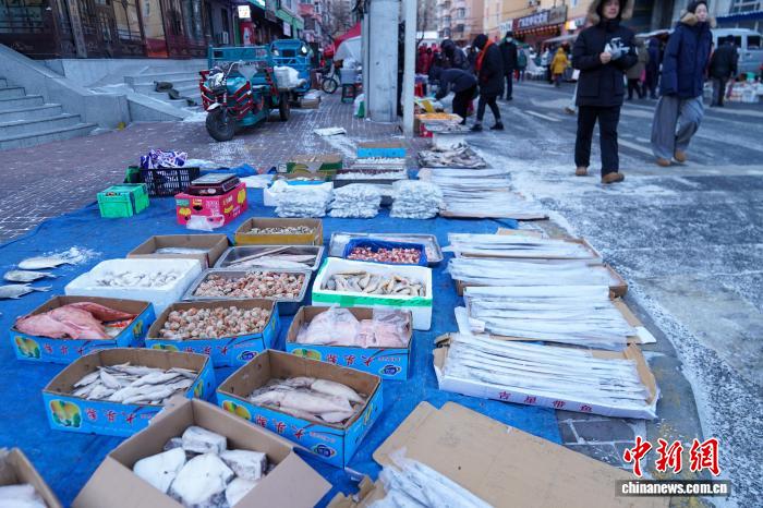 12月2日,黑龙江哈尔滨,各种冻货吸引市民。当日,哈尔滨最高气温今冬首次降到-10℃以下,室外秒变“天然大冰箱”,商贩将冻鱼、冻鸡、冻柿子等摆上街头售卖。 中新社记者 赵宇航 摄