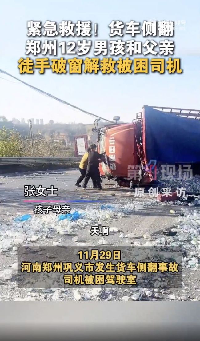 货车侧翻12岁少年跟着父亲冲了上去 父子徒手施救。11月29日,河南郑州巩义市发生了一起货车侧翻事故,司机被困在驾驶室内。一位父亲带着12岁的儿子毫不犹豫地冲上前去,徒手掰开玻璃窗施救。司机当时在呼救,父子俩直接冲过去救人,母亲也立即拨打了120急救电话。孩子的勇敢行为让母亲感到欣慰和骄傲。目前,相关部门正在处理此事。