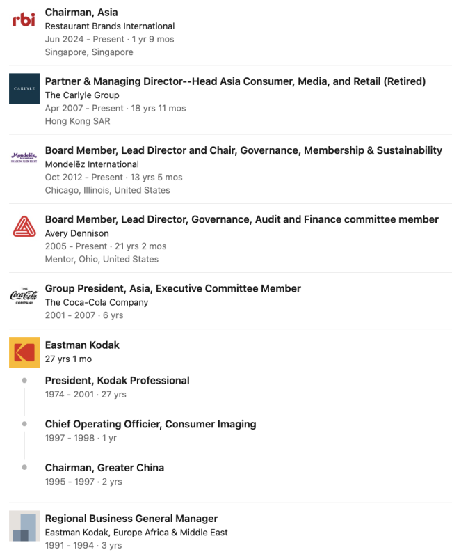 1995年到1997年,Patrick Siewert担任柯达大中华区董事长。2001年到2007年,Patrick Siewert的职位是可口可乐公司亚洲区集团总裁。从2007年开始,他负责凯雷集团在亚洲地区的消费、媒体和零售投资长达16年。