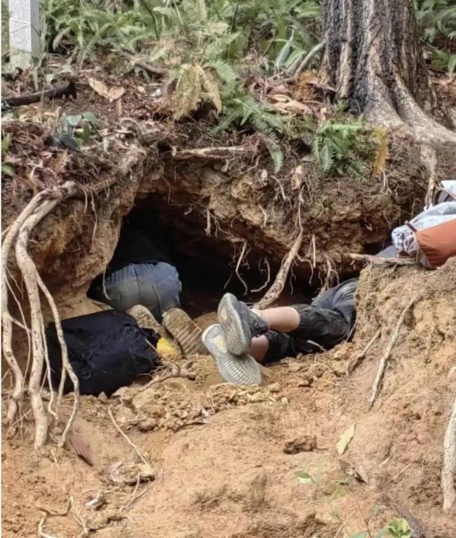从网友发布的图片可见,树木下的水土植被已被挖开多个坑,树枝横架在泥坑上,有孩子拿着工具敲打、挖泥土;有的孩子全身钻进泥坑,趴在泥坑里;还有家长带着孩子在泥坡上走动,其身边有铁锹等工具。提示纸显示,“严禁私挖乱采,保护山体生态”。