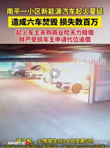 地库内新能源车起火致6辆车焚毁 火灾引发赔偿争议!4月24日凌晨5时左右,福建省南平市延平区碧桂园珑樾台小区地下车库内,一辆新能源汽车突然起火,火势迅速蔓延,引燃多辆车辆,造成财产损失达数百万元。