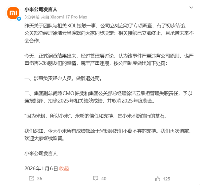 小米公司发言人于1月6日在微博上宣布,针对此前团队与相关KOL接触一事,公司已启动专项调查,并得出初步结论。公关部总经理徐洁云表示,相关接触已立即终止,并承诺未来不会合作