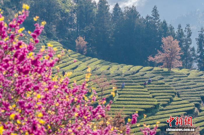 图为恩施花枝山茶园美如画。王关政 摄 图为茶农在“画”中采春茶。王关政 摄