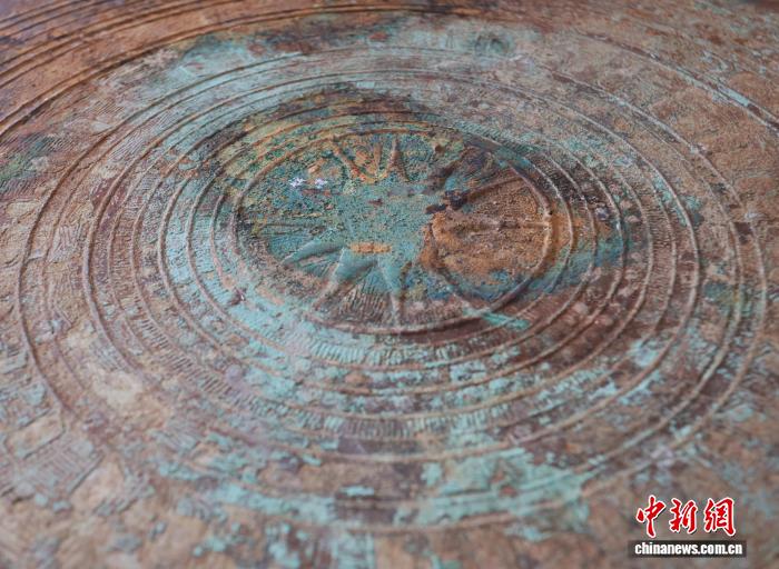 图为铜鼓中心的太阳纹。汤晓逵 摄 图为铜鼓上的纹理。汤晓逵 摄 图为鼓边铸着的青蛙。汤晓逵 摄