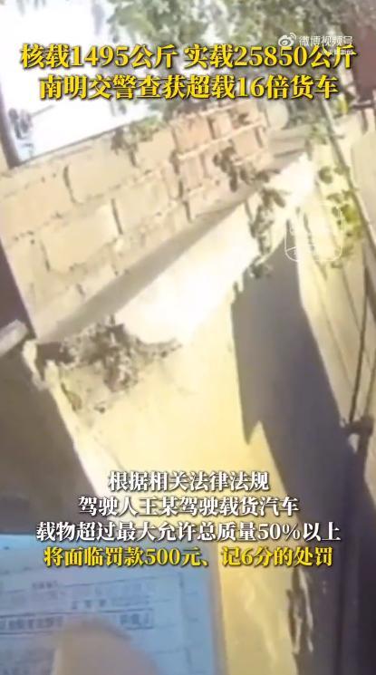 近日,贵阳市公安交通管理局南明区分局查获了一批严重超载的货车。其中一辆轻型自卸货车核定载质量为1495公斤,实际载货质量却达到了25850公斤,超载率约为1629%