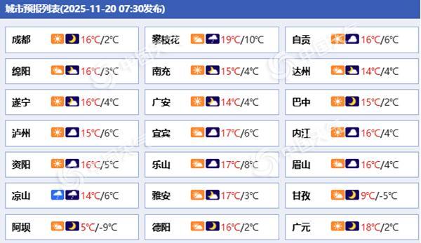 成都今晨最低温2.3℃创下半年来新低。未来三天(11月20日至22日),四川盆地以多云到阴天为主,部分地区有小雨,攀西地区和川西高原雨雪连连,局地有大雪,公众雨雪天气出行请留意交通安全。受冷空气影响,四川南部等地昨天出现降温,局地降温明显,...