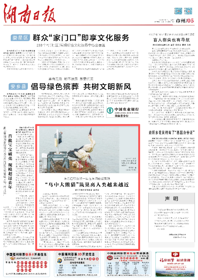 春日的洞庭湖生机勃勃。在湖南东洞庭湖国家级自然保护区岳阳县春风湖外滩,一座20余米高的监控铁塔顶端,一个直径近两米的鸟巢中,东方白鹳正在繁育后代