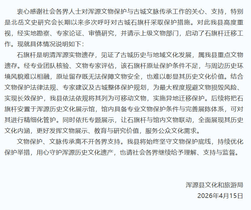 中新网4月15日电 据浑源县文化和旅游局微信公众号消息,山西大同市浑源县文化和旅游局15日发布关于浑源古城石旗杆保护迁移工作的情况说明称,经专业团队核验、文物专家评估,该石旗杆原址保护条件不足,与周边历史环