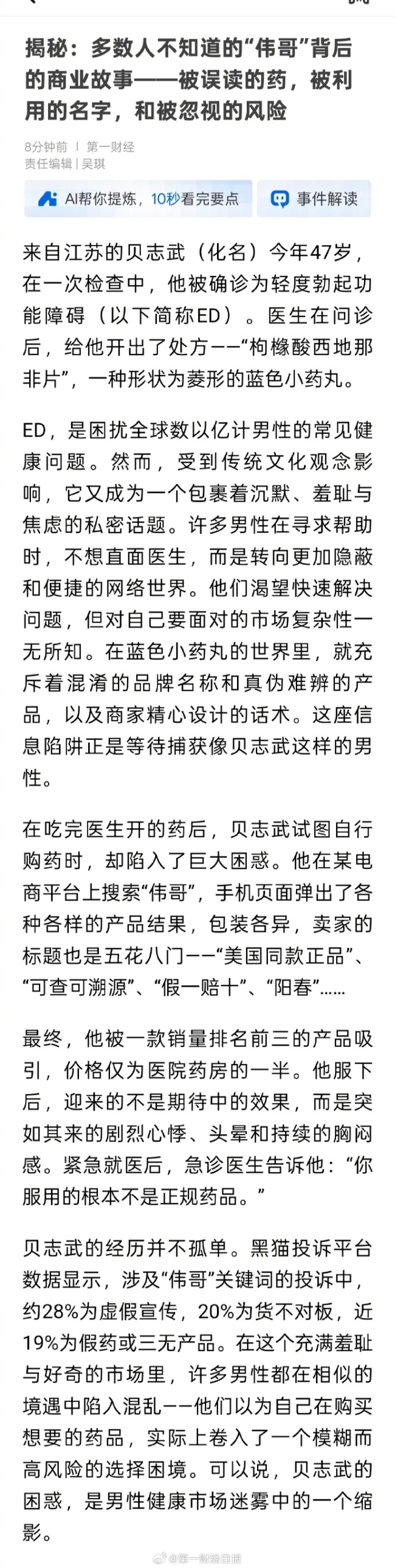 黑猫投诉平台数据显示,涉及“伟哥”关键词的投诉中,约28%为虚假宣传,20%为货不对板,近19%为假药或三无产品。在这个充满羞耻与好奇的市场里,许多男性都在相似的境遇中陷入混乱——他们以为自己在购买想要的药品,实际上卷入了一个模糊而高风险的...