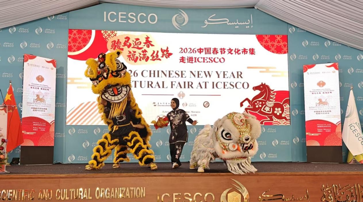 人民网迪拜2月12日电(记者张志文)拉巴特消息:2月11日,在农历马年春节即将到来之际,“骏马迎春福满丝路”中国春节文化市集走进伊斯兰世界教科文组织总部活动在摩洛哥拉巴特成功举办。中外文化融合的舞狮表