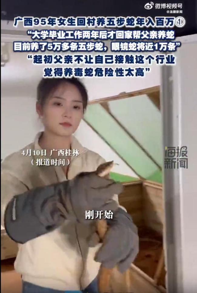 4月10日,广西桂林一位1995年出生的秦女士在大学毕业两年后回到家乡,帮助父亲养蛇。她现在养殖了5万多条五步蛇和将近1万条眼镜蛇,每年收入达到百万。起初,她的父亲并不希望她接触这个行业,认为养毒蛇非常危险