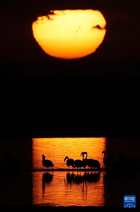 这是12月6日日出时分在埃及法尤姆省加龙湖拍摄的火烈鸟。  每年冬季,大批火烈鸟会飞抵埃及法尤姆省内的加龙湖觅食越冬。  新华社发(艾哈迈德·戈马摄)
