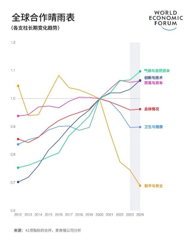 世界经济论坛发布的《2026年全球合作晴雨表》显示,全球贸易与技术合作更倾向于在立场相近的国家间展开,而和平与安全合作则显著下滑